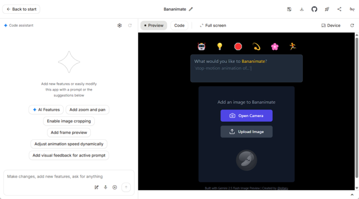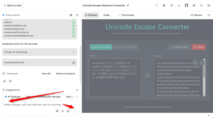 - プレビュー機能でアプリの動作を確認し、必要ならプロンプトを修正して再生成します。+ボタンを押すと画像やテキストをアップロードすることができます。気に入るまで繰り返します。