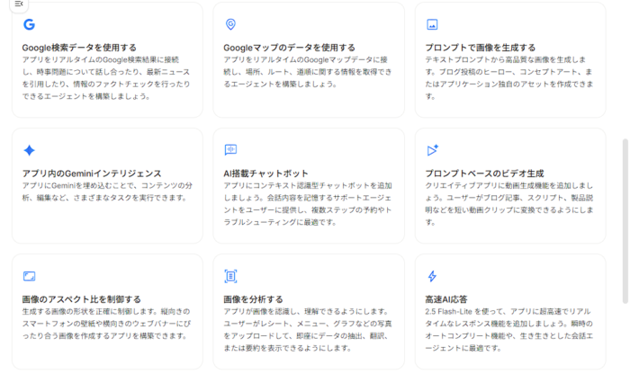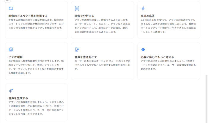 - 最新のAIモデル(Geminiなど)を試せる:テキスト、画像、音声、動画など、マルチモーダルなAIモデルを使える